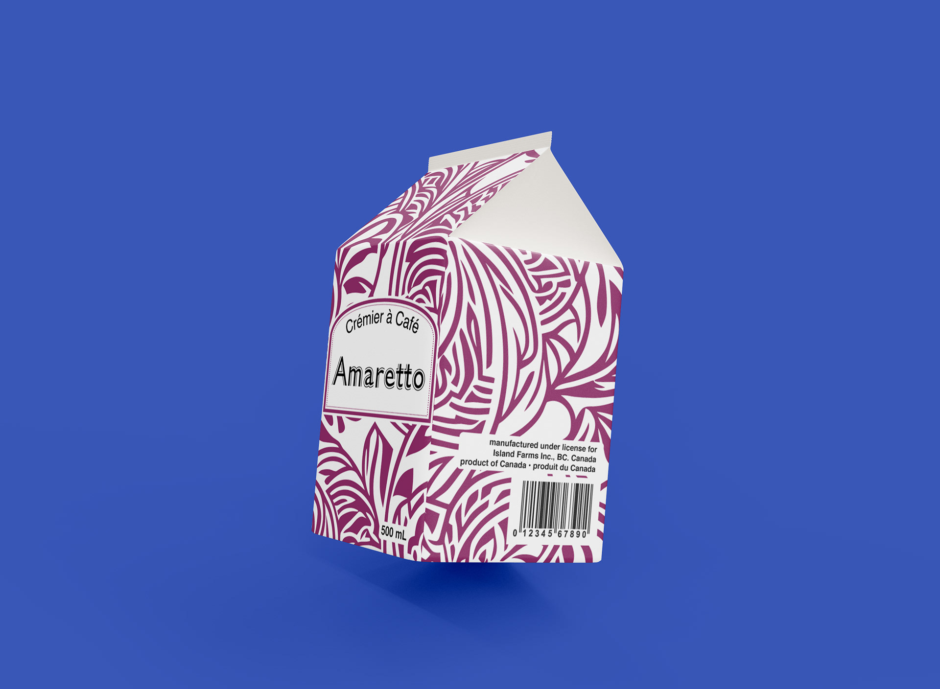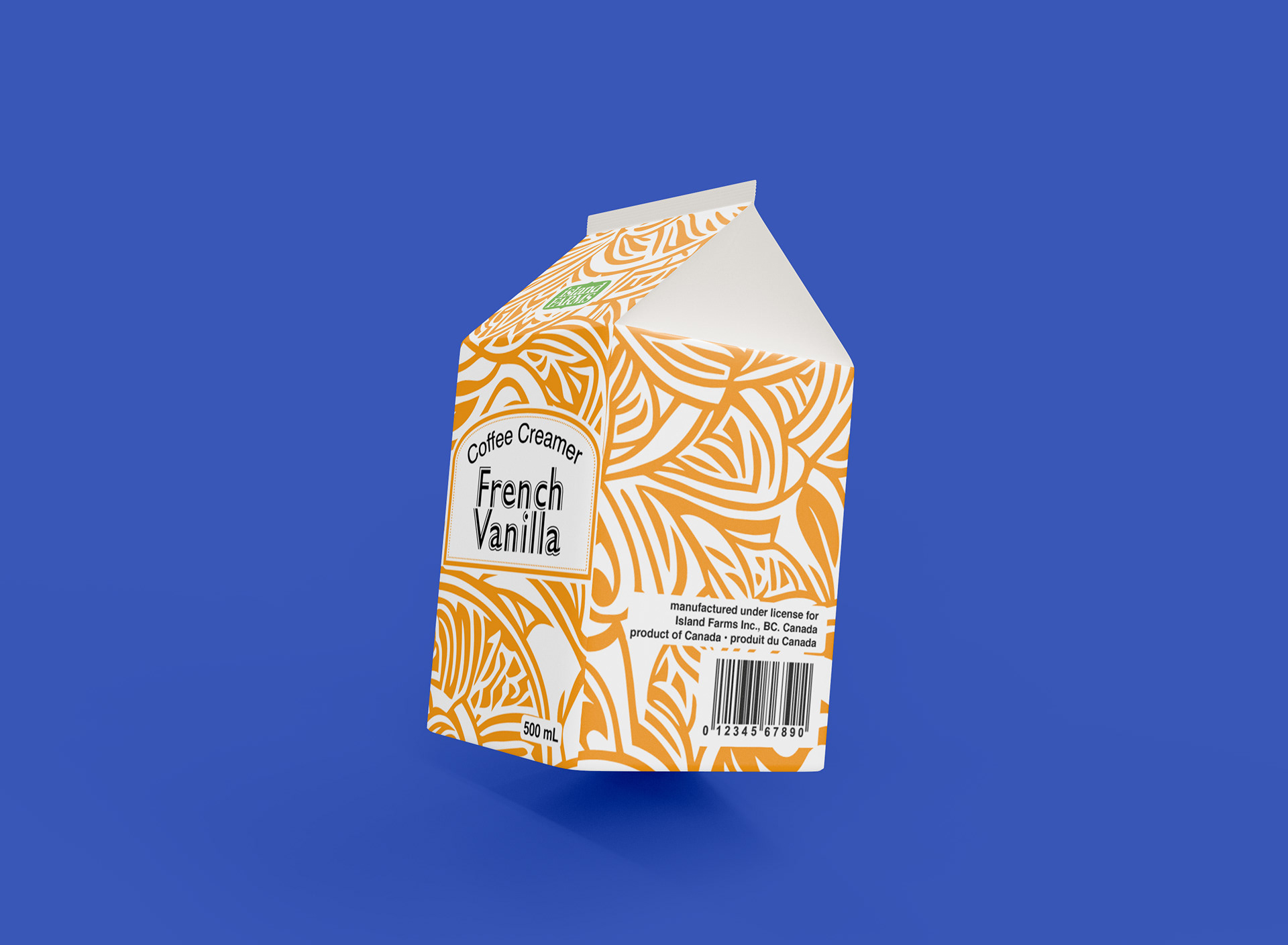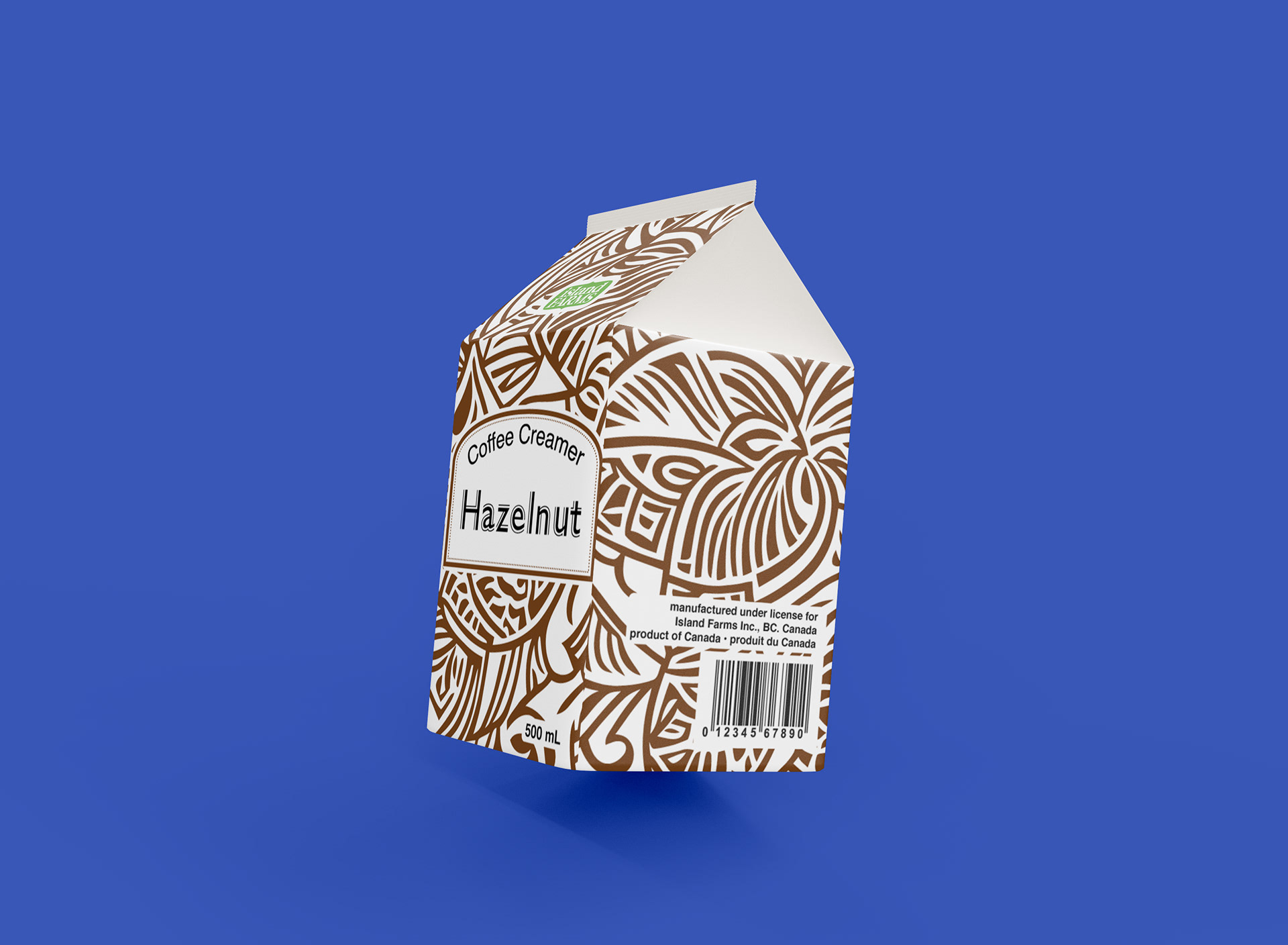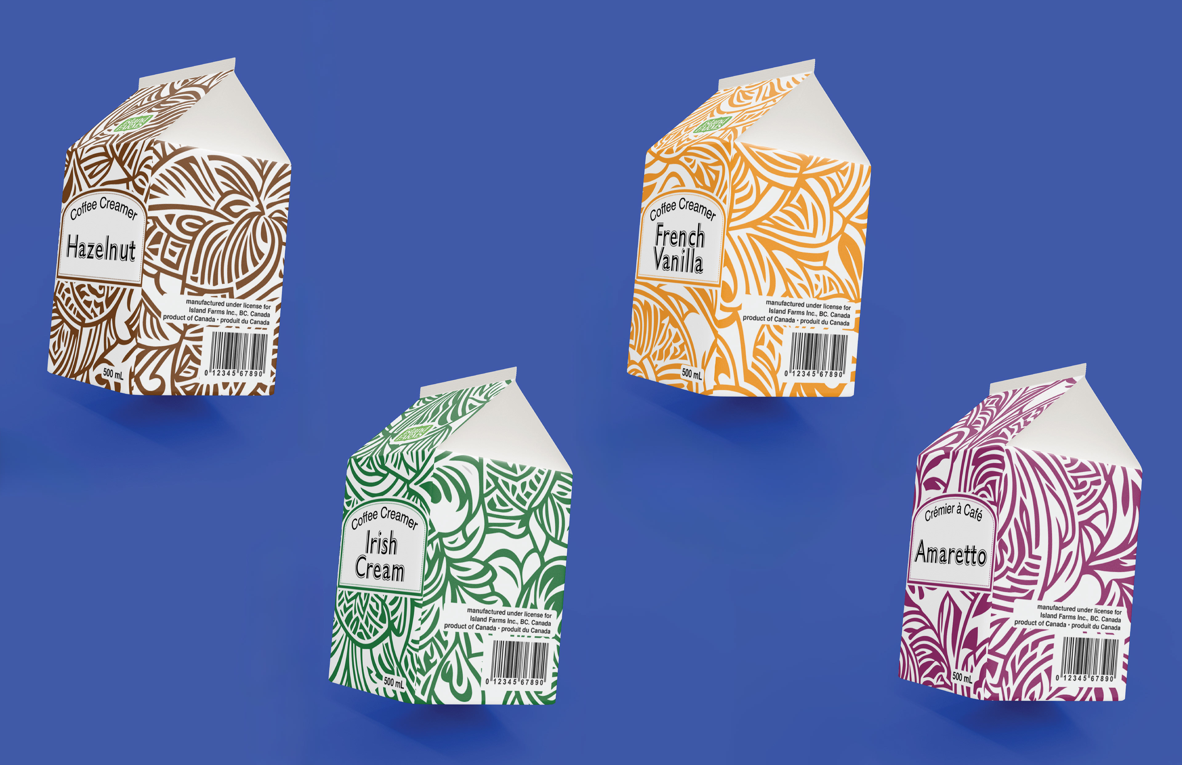This packaging design project. I designed four cartons for Island Farms coffee creamers, each representing a different flavor. To create visual distinction, I developed a unique pattern, then rotated it 90° for each flavor and changed the color scheme accordingly.