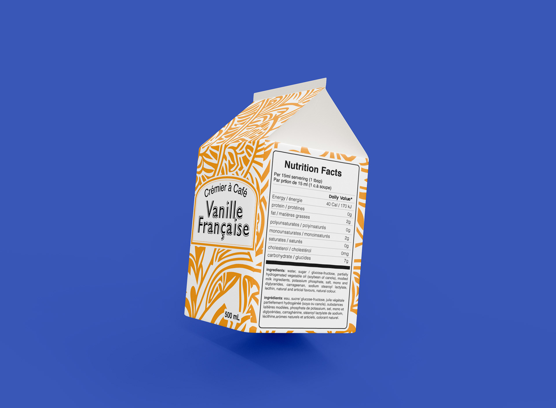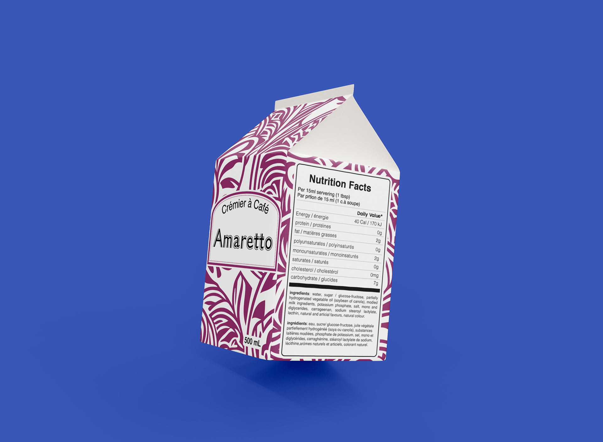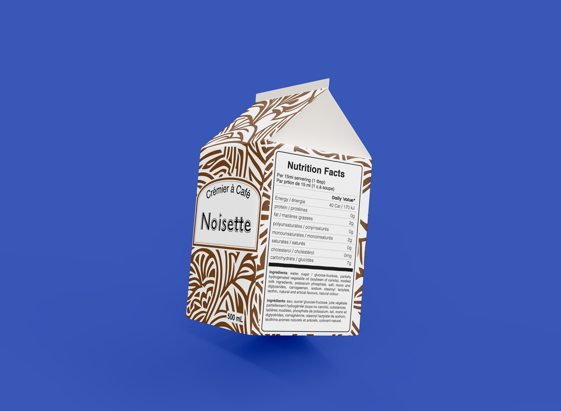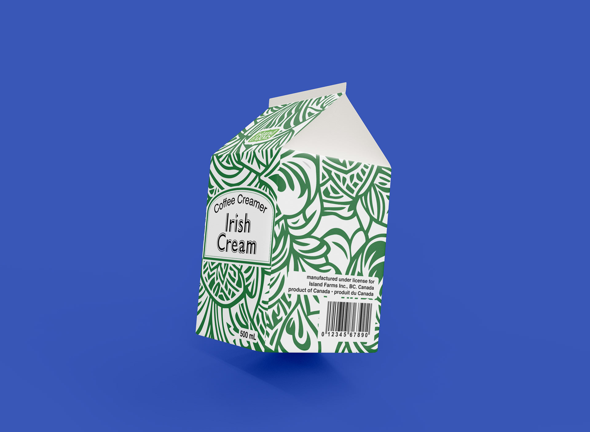 This packaging design project. I designed four cartons for Island Farms coffee creamers, each representing a different flavor. To create visual distinction, I developed a unique pattern, then rotated it 90° for each flavor and changed the color scheme accordingly.