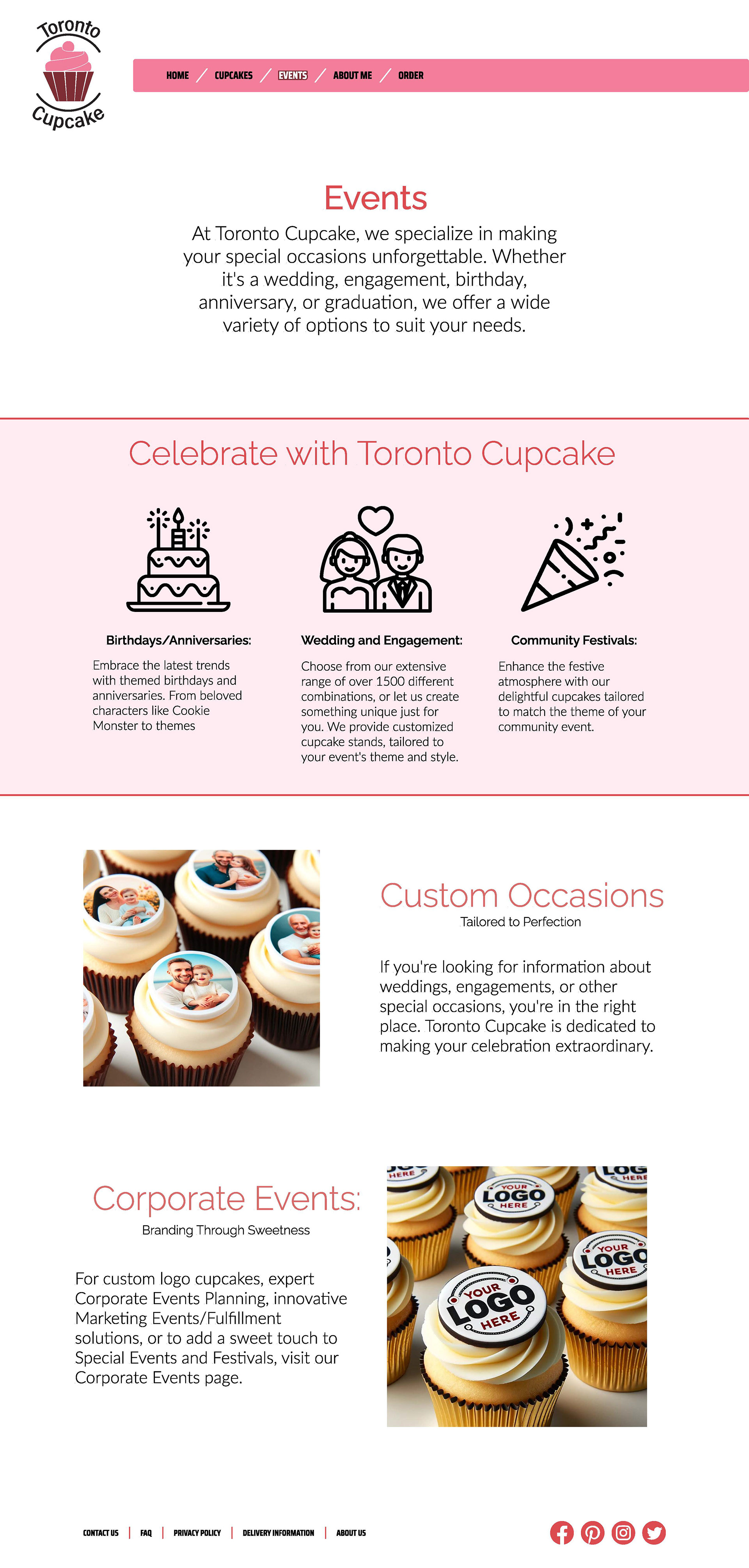 Toronto cupcakes was a class project where we took an older website to redesign. Looking at all their pages we redesigned their nav bar and the footer. I also did a quick refresh of the Toronto cupcakes logo, making it bigger and adding color to it.